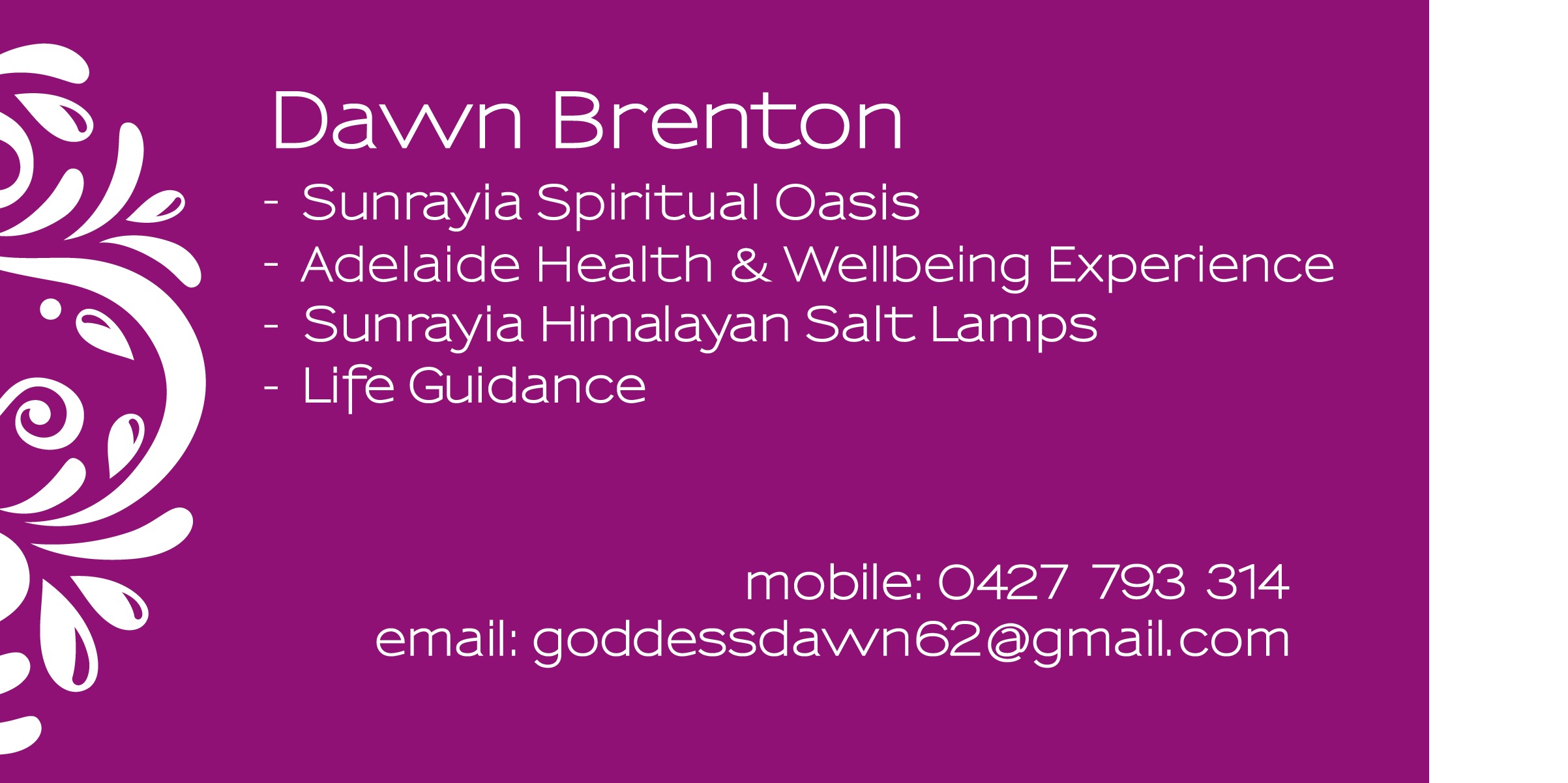 Sunrayia Spiritual Oasis is the vision of Dawn Brenton to facilitate the learning and growth of individuals to reach optimum well-being on all levels. This is achieved by reviewing life-style choices, nutrition, spiritual development and practices. Dawn will assist you in any area of your life where you need support and link you with like minded souls. Dawn has a market stall at various locations with Himalayan Salt Lamps and salt products offered for their health benefits and beauty, as they create a beautiful aura and calming ambience in your living spaces, offices and bedrooms, selenite lamps & crystals, angel figurines and oracle cards. Dawn coordinates the Adelaide Health & Wellbeing Experience at the Church of the Trinity, Clarence Park on the 4th Saturday of each month. 10am-3pm. This market is a unique experience with 25+ stalls where your soul will be pampered, nurtured & inspired. Stalls include sound, crystal & energy healers, intuitive & tarot readers, essential oils, candles, crystals, jewellery and more. You can enjoy fabulous vegetarian & vegan food in a friendly and relaxed space. https://www.facebook.com/Adelaide-Health-Wellbeing-Experience-672988112794692/